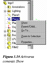 Construirea unui plan paralel cu un plan selectat se poate realiza si cu ajutorul meniului INSERT, REFERENCE GEOMETRY, PLANE. Va aparea o fereastra de dialog care permite alegerea tipului de plan care se doreste a fi inserat în desen.