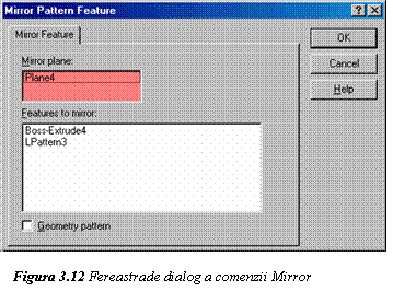 Dupa apelarea comenzii MIRROR FEATURE va aparea o fereastra de dialog. La rubrica Mirror Plane se va selecta Plane 4, iar la Features to Mirror se vor selecta elementele care urmeaza sa fie simetrizate.