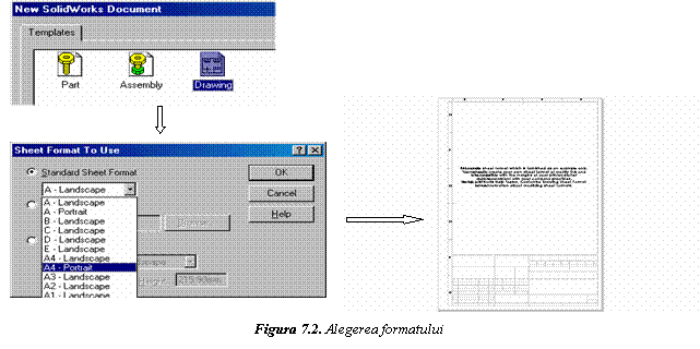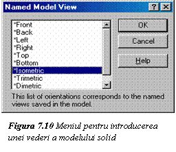 Dupa apasarea acestui buton (figura 7.10 se selecteaza tipul de afisare a modelului dorit precum si una dintre vederile desenului si se alege locul unde va fi amplasata aceasta. În cazul de fata se alege o vedere izometrica a modelului solid. Foaia de lucru cu cele trei vederi ale desenului si cu imaginea tridimensionala a modelului va arata în felul urmator (figura 7.11):