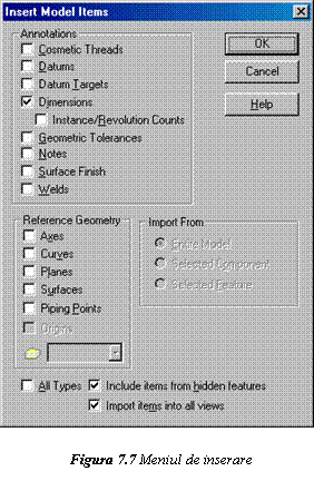 În vederea cotarii, se alege din meniul INSERT, optiunea MODEL ITEMS. Fereastra de dialog care