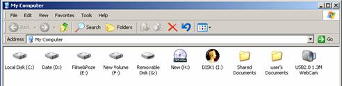 Pentru calculatorul din exemplu se poate vedea ca existǎ un numar de patru partitii, notate cu C:, D:, E:, F:. Pe lānga acestea, īn cazul de fata (nu este obligatoriu sa existe aceeasi organizare pentru alte calculatoare), mai exista G: (Removable Disk - poate sa fie un dispozitiv de stocare a memoriei legat pe portul USB), si H: (care reprezintǎ unitatea pentru citirea CD / DVD-urilor).