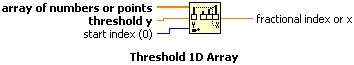 - Functia Threshold 1D Array realizeaza o operatie inversa interpolarii: dispunând de un tablou de valori numerice si de un prag (intrarea threshold y), începând de la un indice specificat, functia cauta doua valori consecutive din tablou astfel încât prima sa fie mai mica decât pragul si a doua mai mare sau egala cu acesta.