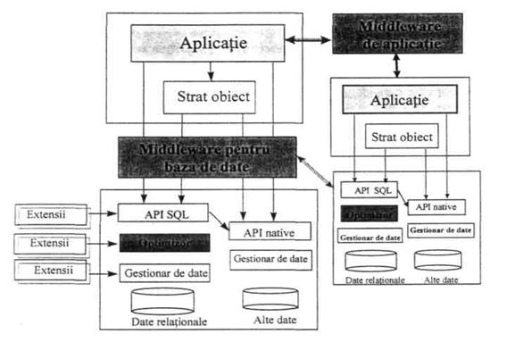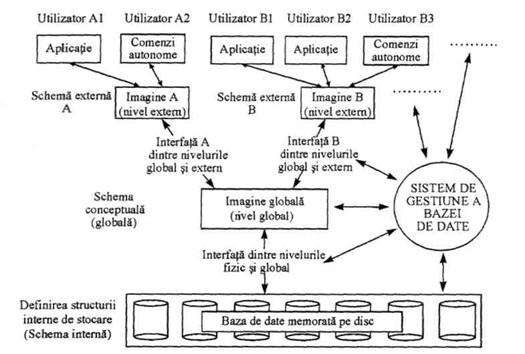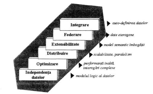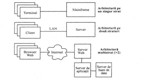 Una dintre schemele clasice de reprezentare a evolutiei organizarii datelor în aplicatiile complexe este cea din figura 1. Cele cinci elemente arhitecturale au fost înglobate, treptat, în "stratul" baza de date, trecând astfel în sarcina programatorilor. Prima etapa este reprezentata de sisteme care utilizeaza modelul file-based (pre-baze de date), a doua - modelul retea, a treia - modelul relational, iar ultima, în curs de maturizare, este etapa SGBD-urilor orientate pe obiecte. Schemei i se poate reprosa absenta unui model important, din care a derivat cel de retea, si anume modelul ierarhic.