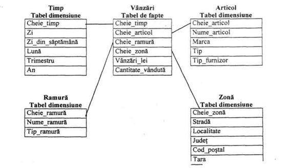 Vânzarile sunt considerate cu 4 dimensiuni numite timp, articol, ramura si zona. Schema cuprinde un tabel central pentru vânzari care contine chei pentru fiecare dintre cele 4 dimensiuni înaintea celor doua masuri: vânzari-lei si cantitate-vânduta.