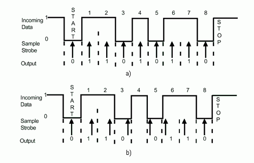 receptorul si emitatorul nu au un semnal de tact comun. Daca duratele celor doua semnale de tact, pentru emitator si receptor, nu sunt egale, apare o decalare, care dupa un anumit numar de biti rezulta intr-o eroare. Pentru a evita aceasta, receptorul trebuie resincronizat regulat la nivel de bit. Din alte motive, trebuie resincronizate si începutul unui caracter, pachet sau mesaj. In figura 3.1, in primul caz, fiecare bit este citit la mijlocul duratei lui, iar in cazul al doilea, bitul 4 se pierde deoarece tactul receptorului este prea incet.