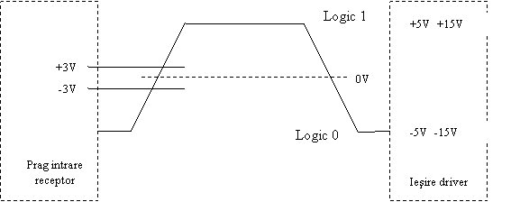 Standardul RS-232 a fost definit în 1962. Cum aceasta a fost înainte de cercetarile asupra TTL, el nu foloseste nivelurile logice de 5 si 0 volti. În schimb, nivelul superior al iesirii driverului este definit ca fiind între +5 si +15 volti, si nivelul inferior al iesirii driverului este definit ca între -5 si -15 volti. Figura 3.2 ilustreaza nivelurile logice definite de standardul RS-232. Este important de mentionat ca nivelul jos (între -5 si -15 volti) este definit ca logic 1 si un nivel înalt (între +5 si +15 volti) este definit ca logic 0.