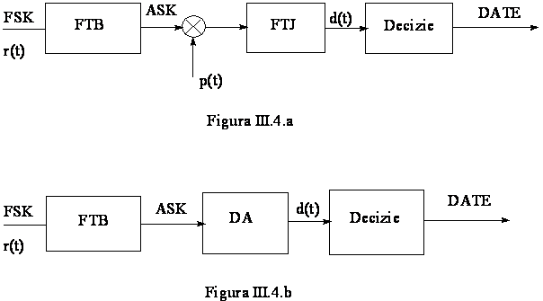 In cazul semnalului FSK, prin filtrare trece banda se poate separa o componenta de tip ASK unipolara dupa care se poate utiliza o schema de demodulare de amplitudine (fig. III.4.a; fig. III.4.b).