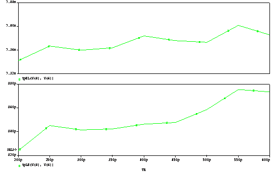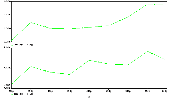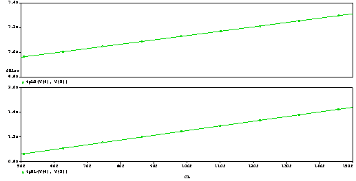 D 555g68f eterminati prin simulare parametrica si folosind functii tinta in Probe dependenta timpilor de propagare a circuitului (de la intrarea de clock la iesiri) in functie de capacitatea de sarcina (CL), respectiv in functie de timpul de tranzitie (TR) al formei de unda al intrarii de clock. In ambele analize parametrice variatia parametrilor se va face in intervalul (0.5 1.5)* val. adoptata conform tehnologiei. D 555g68f eterminati si notati pe graficele obtinute valorile intarzierilor de propagare corespunzatoare valorilor adoptate pentru CL si TR.
