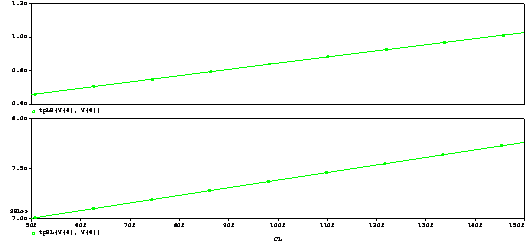 determinati pe baza graficelor obtinute valorile pentru tpintrinsec si Kload si completati un tabel de felul urmator (tpintrinsec corespunde valorii CL=0pF):
