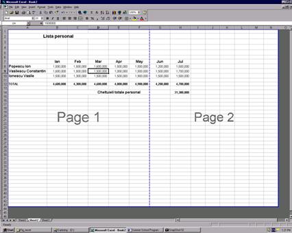 Daca pe ecran apare un mesaj, executati clic pe OK. Foaia de calcul va fi afisata cu intreruperi de pagina, ca in figura 10.6.