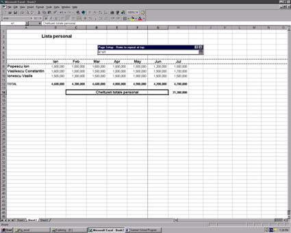 Selectati cu mouse-ul randurile care vreti sa fie tiparite pe fiecare pagina, ca in figura 10.7. Zona selectata va fi inconjurata de un chenar cu linie intrerupta, iar referintele absolute la celule din caseta de text Rows to Repeat at Top apar insotite de simbolul dolarului ($).