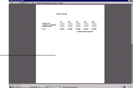 Dupa ce stabiliti configuratia paginii si partea pe care vreti sa o tipariti, trebuie sa vedeti cum va arata pagina la tiparire. Pentru a revizui o lucrare de tiparit, deschideti meniul File si selectati Print Preview sau executati clic pe butonul Print Preview de pe bara cu instrumente standard. Pe ecran va fi afisat registrul de calcul in forma pe care o va avea dupa tiparire, ca in figura 10.2.