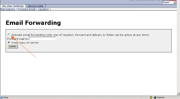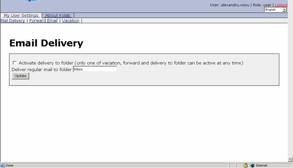 Permite livrarea mail-urilor sosite catre o alta adresa, specificata de Dvs. Daca se doreste acest lucru, se va bifa check-boxul si in campul text Forward e-mail to.. se va introduce adresa de mail la care sa fie livrate.