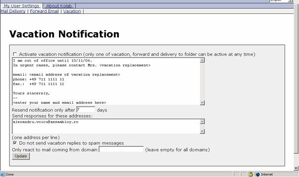 Activarea acestei optiuni se face prin bifarea check-boxului "Activate vacation notification", iar dezactivarea ei prin eliminarea bifei .