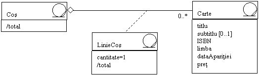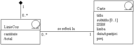 În cazul nostru, LinieCos este asociata relatiei dintre Cos si Carte, în asa fel încât, unui obiect Cos legat de un obiect Carte sa i se poata asocia o instanta LinieCos care sa contina atributul <<cantitate>> si care sa precizeze câte carti de acest fel intentioneaza sa cumpere clientul. Acest lucru este reprezentat în diagrama din figura 2_3. Atributul <<cantitate>> este pozitionat implicit pe 1.