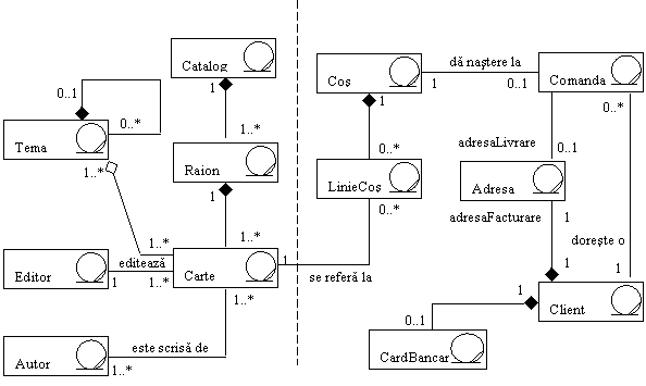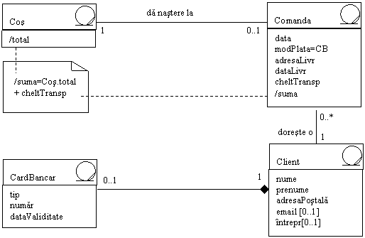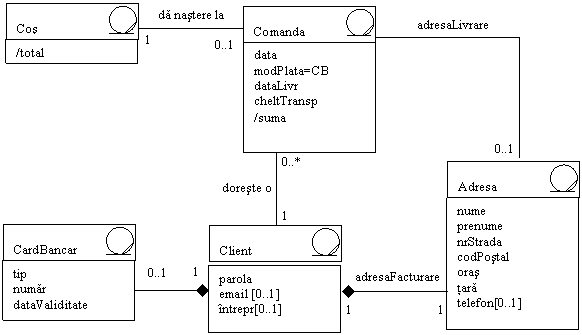 Asocierile Client - Adresa si Comanda - Adresa sunt specializate si îndeplinesc anumite roluri. Adresa de facturare este obligatorie si dispare în cazul în care dispare clientul (este deci o compunere). Adresa de livrare nu este obligatorie si ramâne o simpla asociere cu un indicator de multiplicitate 0..1 la capatul din spre Adresa.
