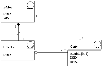 Putem introduce o asociere între Colectie si Editor de tip compunere (vezi figura 2_11). Dat fiind faptul ca aceasta asociere este, într-un fel, redundanta pentru schema noastra deoarece atât colectia cât si editorul au fost deja asociate cartii, ea poarta numele de asociere derivata.