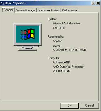 Pentru a vizualiza informatiile referitoare la sistemul de operare instalat pe calculatorul pe care lucram, pentru a afla de asemenea tipul procesorului, RAM instalata, dispozitivele hardware ale sistemului etc, se selecteaza cu butonul din stânga al mouse-ului pictograma My Computer unde se va deschide un meniu de unde alegem optiunea Properties, care va deschide caseta de dialog alaturata.
