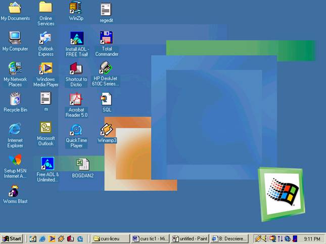Dupa pornirea calculatorului, interfata grafica a programului Windows 2000 este afisata. Ca prima "imagine", apare ecranul PC-ului asa-numitul Desktop, un fundal gol pe care apar cel putin doua simboluri (My Computer si Recicle Bin).
