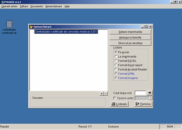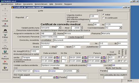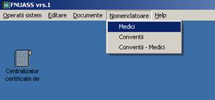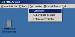 Dupa ce ati completat nomenclatoarele puteti sa introduceti certificatele medicale folosind comanda 'Certificate'. Certificatele vor fi raportate la FNUASS pe suport de hartie folosind comanda de 'Listare Centralizator' si in format electronic folosind comanda 'Export baza de date'.