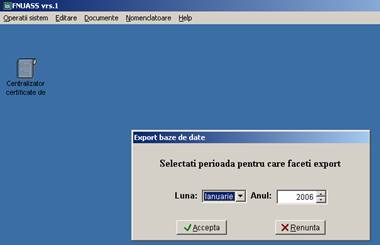 Pentru exportul bazei de date veti alege mai intai luna pentru care faceti raportare la CNAS si anul. Puteti opta sa copiti fisierul pe disketa sau sa salvati fisierul in directorul 'Arhiva' al aplicatiei \Program Files\FNUASS pentru a-l copia ulterior pe disketa (daca raspundeti cu 'Nu' la intrebarea 'Doriti sa copiati fisierul pe disketa?' acesta se va salva in directorul arhiva):