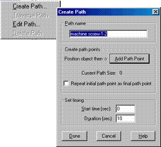 Prin folosirea butonului fiecare element selectat se va muta īn pozitia dorita dupa care se apasa butonul Add Path Point. Se va stabili apoi momentul īn care elementul respectiv īsi va īncepe miscarea (Start time). Daca se doreste modificarea unui pas se alege optiunea Edit Path. Daca se selecteaza din AnimationManager unul din pasii creati si se apasa butonul din dreapta al mouse-ului se poate alege optiunea Traverse Path care va simula traseul si miscarea elementului sau se poate alege optiunea Delete Path care va duce la eliminarea din schema a pasului respectiv.