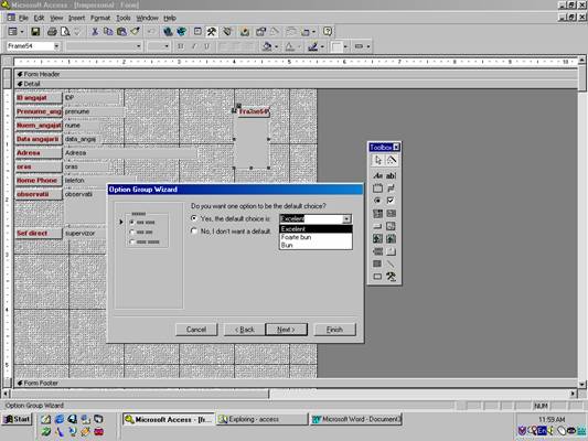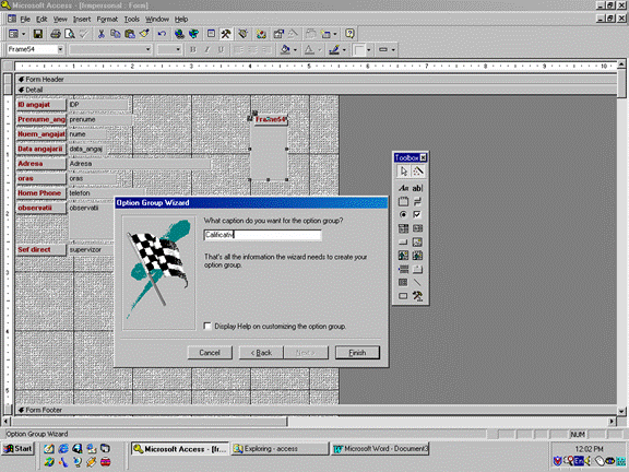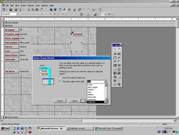 Al patrulea dialog Option Group Wizard permite asocierea grupului de optiune unui camp, in cazul nostru campului calificativ