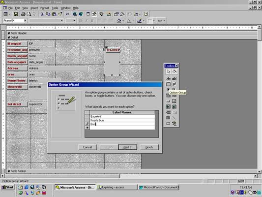 Se completeaza in fereastra Option Group Wizard trei etichete pentru trei optiuni: Excelent, Foarte bun si Bun