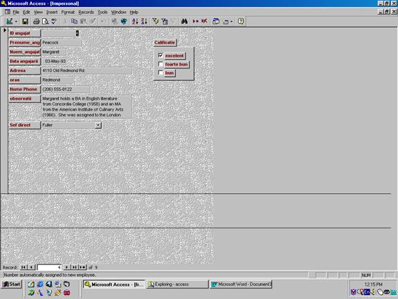 Sa presupunem ca atunci cand adaugam noi inregistrari in tabelul personal prin intermediul formularului frmpersonal, vrem ca la completarea campului calificativ sa nu tastam noi calificativul in casuta de text respectiva ci sa putem alege o optiune dintr-un grup de optiuni date.