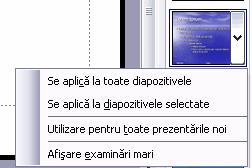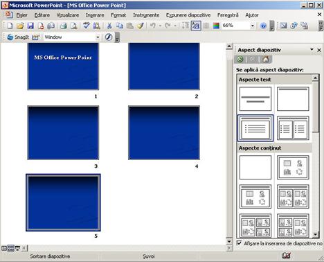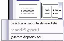 Pentru a aplica un tip de design, se selecteaza Panoul Aplica Aspect Diapozitiv cu un click de mouse; diapozitivul selectat va aparea īn Panoul de diapozitive ca si īn imaginea de mai jos :