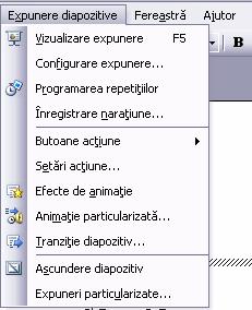 Pentru īmbunatatirea prezentarii se pot folosi diferite optiuni de animatie si efecte speciale (se aplica pentru un text sau un element grafic al unui diapozitive), respectiv tranzitii īntre diapozitive (se aplica pentru īntregul diapozitiv). Acelasi tip de tranzitie se poate aplica pentru un singur diapozitiv sau pentru toate.
