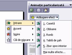 Dupa alegerea animatiei sau tranzitiei se selecteaza tipul specific pentru acestea: