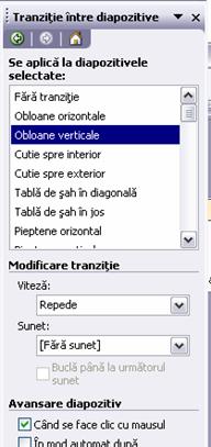 Īn cazul tranzitiilor se poate alege: tipul tranzitiei, numǎrul de diapozitive la care sa se aplice, viteza animatiei, un sunet, modul de avansare diapozitiv, etc.