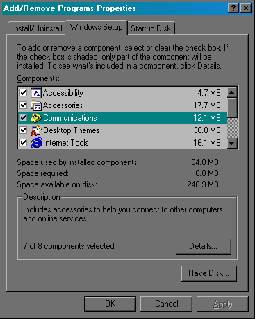Apasati pe Windows Setup si apoi pe Communications. Apasati apoi pe Details. Bifati Dial-Up Networking si apoi apasati butonul OK. Daca va apare un mesaj in care vi se spune ca unul sau mai multe din fisierele care sunt instalate exista deja si pe calculator exista o versiune mai noua alegeti ca sa pastrati fisierul mai nou.