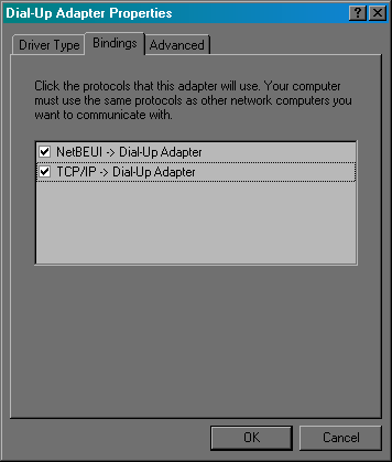 La pasul urmator trebuie sa apasati cu un singur clik pe Dial-Up Adapter ( in cazul in care nu este prezent ) si apoi pe Properties. Apasati apoi pe Bindings si fiti sigur ca TCP/IP este bifat. Click OK si daca vi se cere reporniti Windows-ul.
