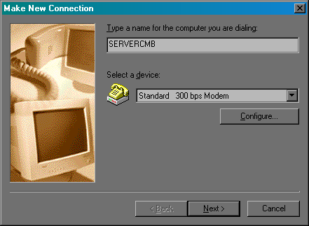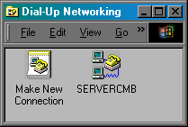 Acum veti seta o conexiune pentru CMB. Mai intai in Dial-Up Networking ( care se gaseste in My Computer ) dati un dublu clik pe Make New Connection. Daca este prima dumneavoastra conexiune atunci calculatorul nu va va arata decat aceasta icoana. Urmati instructiunile care va apar pe ecran. Prima oara va trebui sa dati un nume conexiunii ( de exempul SERVERCMB ) de asemenea in aceasta fereastra ar trebui sa aveti scris si numele modemului.