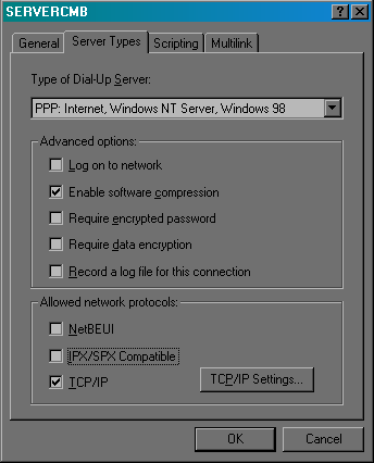 Dati un clik server type si fiti sigur ca tipul serverului este PPP, si ca la Advanced options nu sunt bifate decat casutele: Enable software compression si ca la Allowed network protocols nu este bifat decat TCP/IP