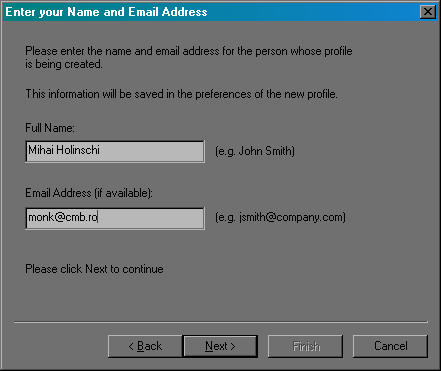 In partea intai a acestui document, am descris metoda de configurare a programului Netscape Navigator, plecand de la premiza ca acesta era deja instalat, si exista deja un profil de utilizator. Dar daca nu exista? Lucrati pe un calculator unde lucreaza si altii, si nu doriti ca respectivii sa va foloseasca optiunile, contul de e-mail, etc..