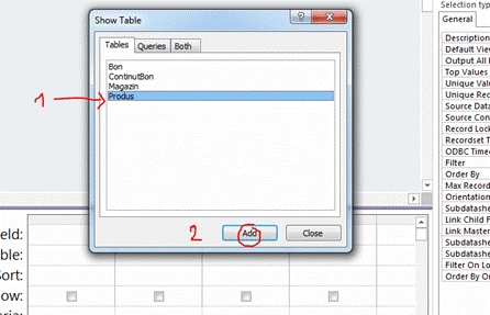 Pentru implementare, din bara principala alegem CREATE Query Design. Apare fereastra cu tabelele disponibile, deoarece trebuie sa specificam din ce tabela provin coloanele pe care dorim sa le obținem in cadrul interogarii.
