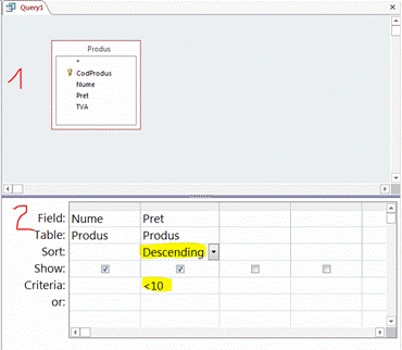 Acum trecem la Criteria, pe coloana Pret condiția <10, iar pe linia Sort alegem Descending pentru a ordona rezultatul descrescator.