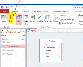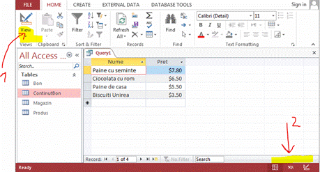 Sa presupunem ca dorim sa afișam produsele cu prețul mai mare de 10 RON. Deci trebuie sa navigam din ecranul curent cu rezultatul interogarii, in ecranul anterior, unde am definit interogarea. Avem ca de obicei mai multe posibilitați: