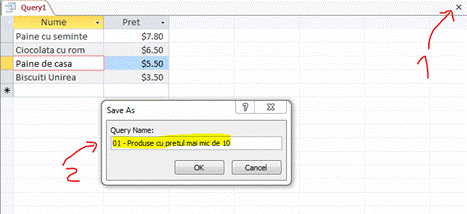 Vom salva interogarea apasand butonul de inchidere X (1), și trecem denumirea „01 – Produse cu pretul mai mic de 10” (2):