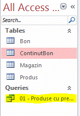 Tot in lista de obiecte, clic dreapta și Paste. Modificam denumirea astfel incat sa fie „02 – Bonuri cu produse cu prețul mai mic de 10, sub 5 buc”. Am facut acești pași pentru a duplica interogarea, deoarece este similara cu prima;