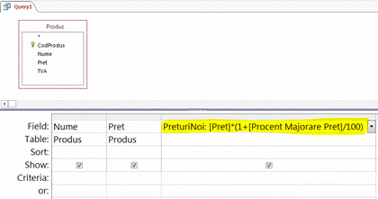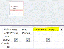 Operațiile pot fi folosite și pentru a adauga in rezultatul interogarii coloane noi, care nu exista in tabelele originale. De pilda, vrem sa afișam produsele și o coloana care sa conțina prețul produsului majorat cu 10%. Cream o interogare bazata pe tabela Produs, dupa cum urmeaza: