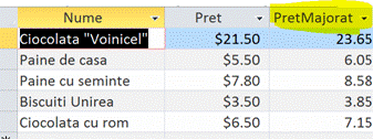 Am introdus coloanele Nume și Pret, apoi in a treia coloana am intrdous formula: