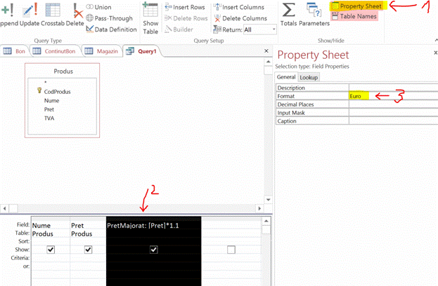 Observați a treia colana, care are ca rezultat operația [Pret] * 1.1. Dorim sa formatam aceasta coloana ca și valuta, astfel incan valorile sa fie prefixate cu simbolul aferent (In cazul de fața „$”, dar acesta poate fi determinat de setarile regionale ale calculatorului). Ne intoarcem in Design View și: