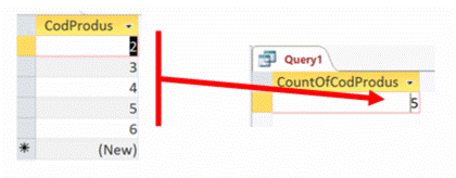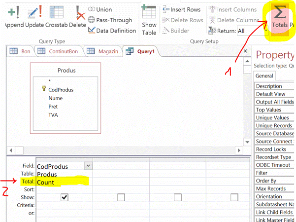 In cazul de mai sus aveam in baza de date 5 produse, și au fost afișate codurile lor. Acum intoarceți-va in Design View și dați click pe Totals (1)