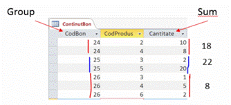 CodBon, pe care aplicam funcția Group, pentru a crea „grupuri” in cadrul rezultatului. Pentru fiecare CodBon se creaza cate un grup. In imaginea de mai sus avem 3 grupuri, corespunzator celor 3 bonuri diferite (24, 25, și 26).