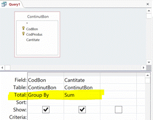 Acum creați o noua interogare bazata pe tabela ConținutBon, cuprinzand campurile CodBon și Cantitate, și activați butonul Totals.
