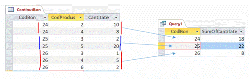 Cantitate, pe care aplicam funcția Sum, pentru a insuma numarul de produse din cadrul fiecarui grup creat pe CodBon. De exemplu, pentru bonul 24, numarul total de produse este 10 + 8 = 18.